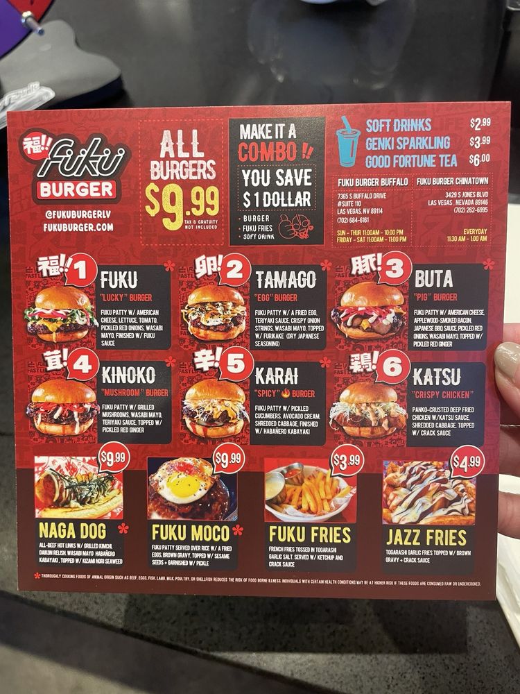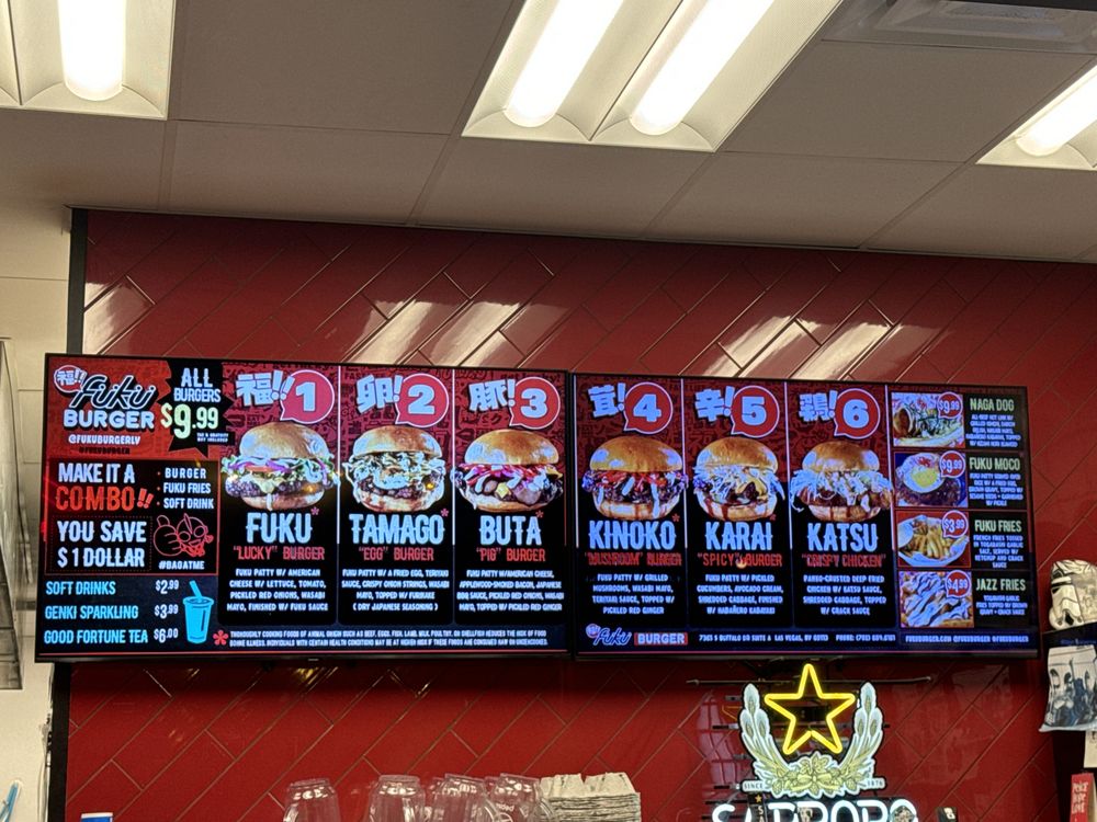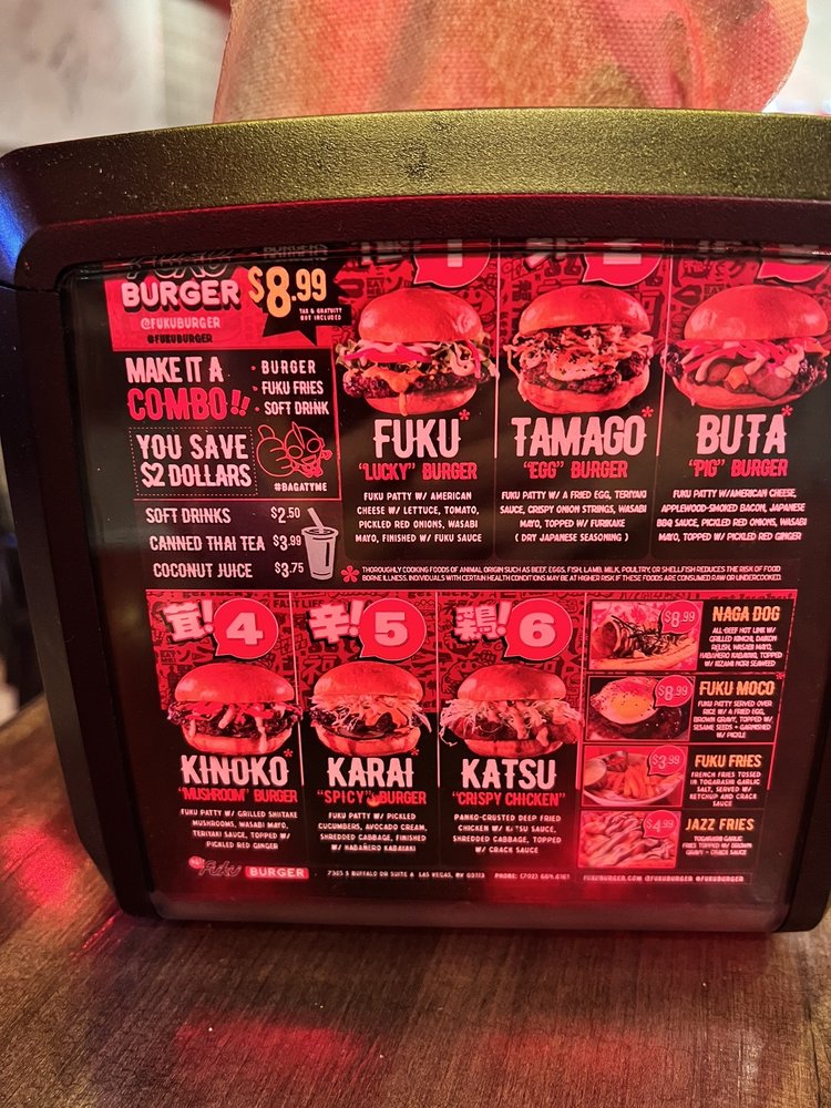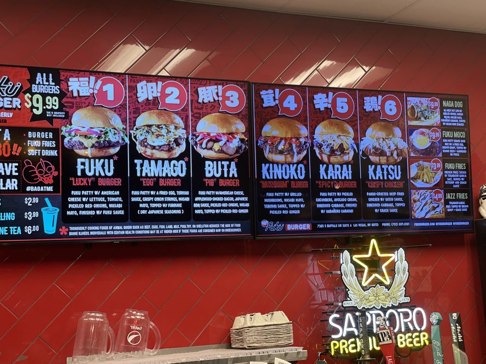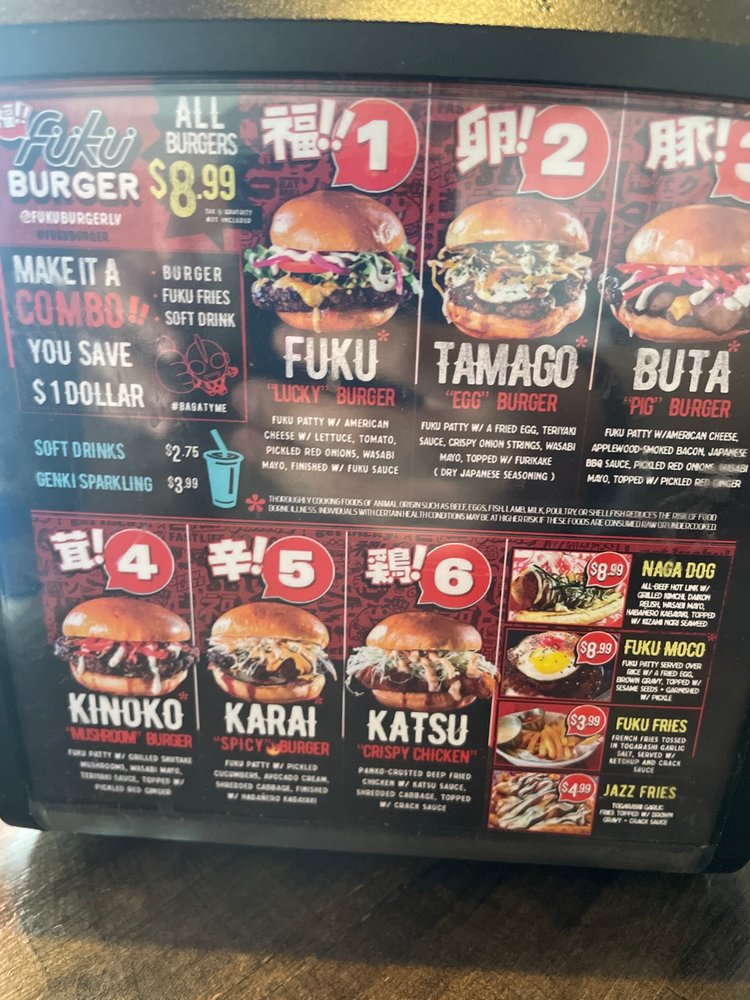 Welcome to Fukuburger Buffalo! This trendy and casual restaurant offers a unique Asian fusion menu with a focus on burgers and fries. Located in Las Vegas, NV, Fukuburger Buffalo provides delivery, takeout, and reservation options. With limited vegetarian choices, this spot is perfect for groups and families looking for a fun dining experience. Try their signature Fuku Burger or the flavorful Tamago burger with Jazz fries for a delicious meal. Customers rave about the juicy beef patties, soft buns, and friendly service. The vibrant anime-themed ambiance adds to the overall dining experience. Don't miss out on the opportunity to indulge in these flavorful dishes at Fukuburger Buffalo.